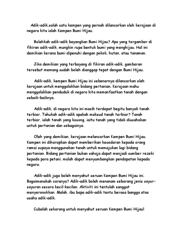 Adik-adiksalah satu kempen yang pernah dilancarkan oleh kerajaan di negara kita ialah Kempen Bumi Hijau. Kerajaan Negeri akan terus komited di. Kempen Bumi HIjau Kemahiran Objektif Dengar dan sebut Kemahiran Mendengar Pada akhir pembelajaran.